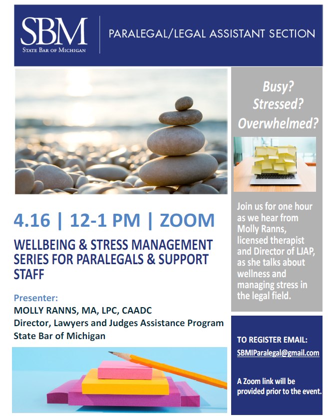 Join us for our Wellbeing & Stress Management Series for Paralegals & Support Staff on April 16 from 12:00-1:00 PM via Zoom.If you have been feeling busy, stressed, or overwhelmed, this session is for you. We are pleased to welcome Molly Ranns, MA, LPC, CAADC, Director of the Lawyers and Judges Assistance Program at the State Bar of Michigan, who will share insight on wellness and managing stress in the legal field.Presenter:Molly Ranns, MA, LPC, CAADCDirector, Lawyers and Judges Assistance ProgramState Bar of MichiganTo register:Email SBMIParalegal@gmail.com A Zoom link will be provided prior to the event.We hope you will join us for this important and timely conversation.