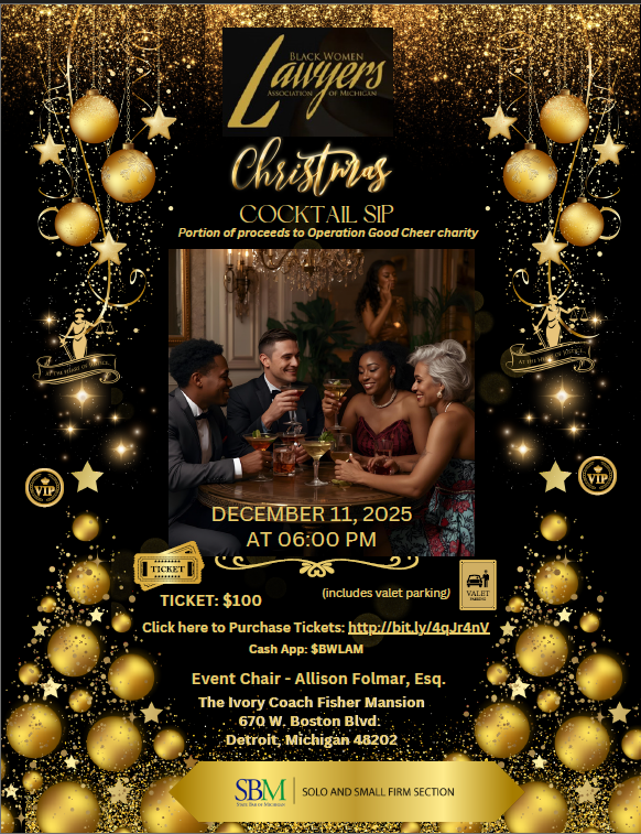 The SBM Solo & Small Firm Section is proud to be a sponsor for this year's Black Women Lawyers Association of Michigan (BWLAM) charity Christmas Sip event. The event will take place on Thursday, December 11th at 6:00 p.m.